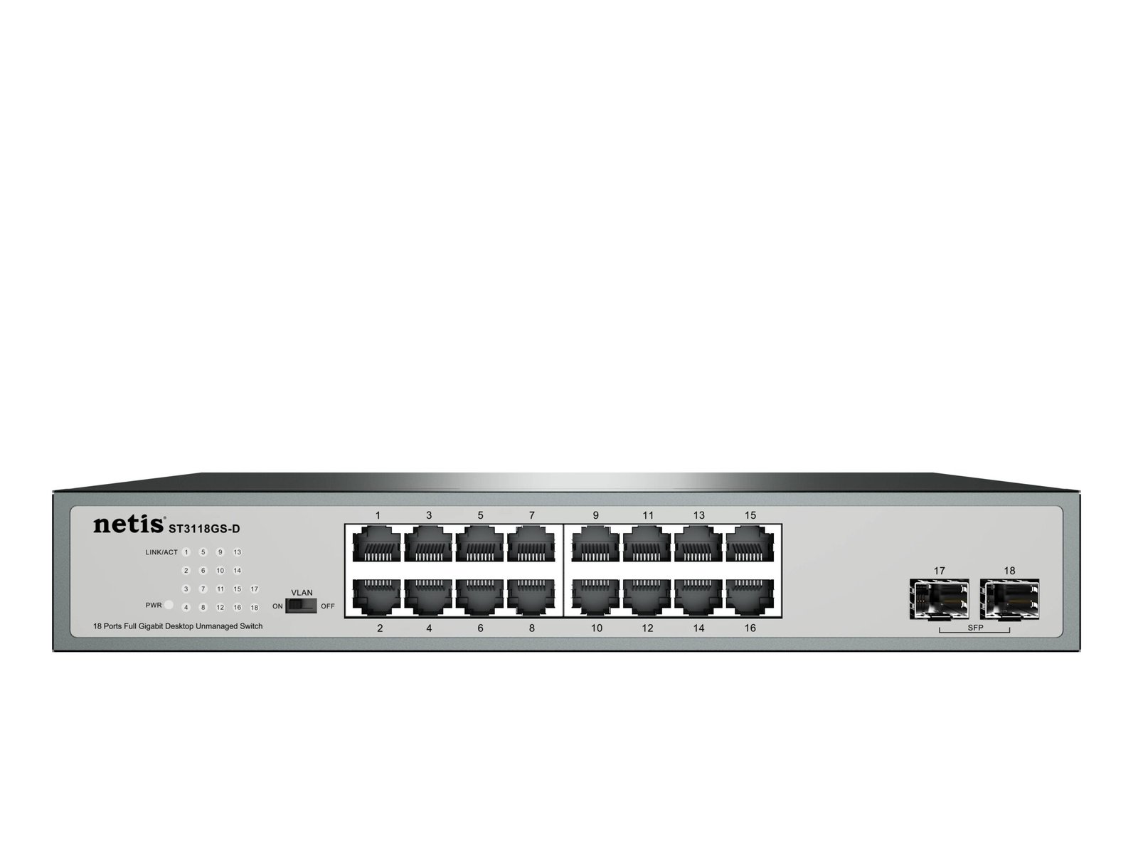 Switch NETIS modelo ST3118GS-D – 16 Puertos y 2 Puertos SFP Gigabit, montable en rack, No administrable