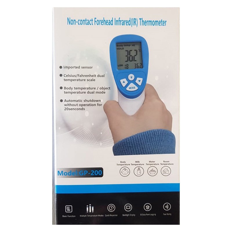 Termómetro Infrarrojo Modelo GP-200 – marca Yobekan. Permite detectar temperatura humana por vía infrarrojo, funciona con baterías AA (No incluidas).